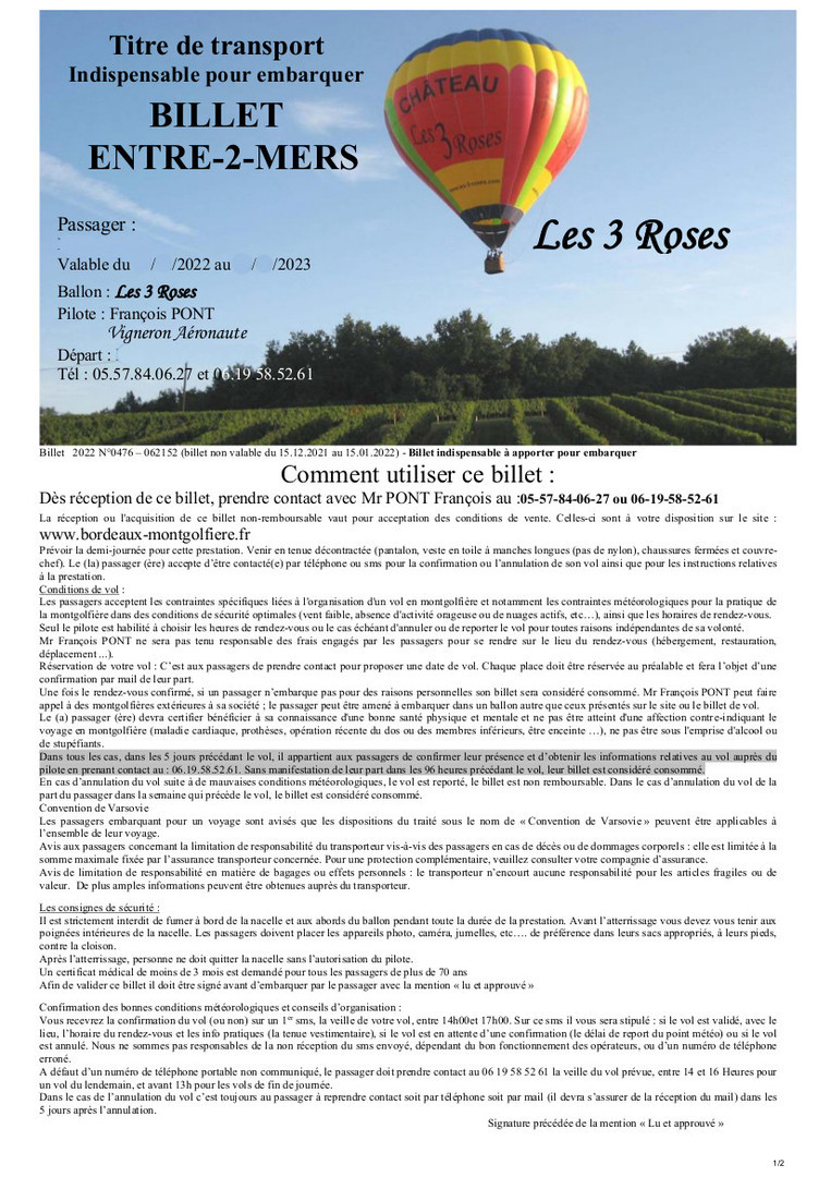 nous vous confirmons le vol en montgolfière du : samedi 30 NOVEMBRE 2024